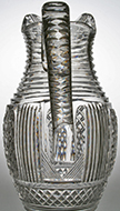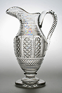 | W10878 Magnificent Georgian helmet shaped ewer cut with saw tooth rim and horizontal prisms over arcaded reserves of strawberry diamonds above a horizontal band of diamonds and basal horizontal prisms, on pedestal foot cut with radiating mitre flutes. Notched handle cut with interlocking mitre flutes. Circa 1820.
