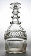 | W10661 Rare Georgian barrel shaped magnum-sized decanter, the neck cut with vertical flutes between three plain neck rings over broad shoulder flutes and a horizontal prism above a band of diamonds, two horizontal prisms and basal fine vertical hollow comb flutes. Star-cut mushroom stopper. Capacity: 2 x 75cl bottles. Provenance: Corn Hall, Bures, Suffolk. Circa 1820.