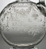 | W10935 Beautiful Victorian magnum sized shaft and globe claret jug, the neck and spherical body finely engraved all over with festoons of flowers and foliage, swags of ivy, butterflies and scrollowork on foot engraved with a row of spots. Handle with base engraved en suite. Original matching hollow blown stopper surmounted by tiny ball finial. Probably Thomas Webb & Sons, Stourbridge. Circa 1880.