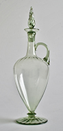 W10876 Rare Art Nouveau sea green amphora shaped claret jug decorated with subtle vetical optical ribbing, on ribbed foot. Plain handle. Original twisted spire stopper. Designed by Harry Powell for James Powell & Sons, Whitefriars, London for the Prince of Siam 'lotus' service. Circa 1900.