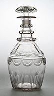 W10716 Fine Georgian decanter, the neck cut with broad flutes between three facet-cut collars, the body cut with broad shoulder flutes over a band of diamonds above diamond-edged panels containing diamond-edged arcaded reserves each enclosing an emblazoned band of diamonds. Cut disc stopper. Probably Cork, Ireland. Circa 1790.
