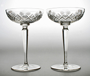 W10837 Elegant set of six French champagne glasses or coupes with bowl cut with cross-cut diamonds and large stars, on tall tapering fluted stems. Probably St Louis, France. (Two shown). Circa 1930.