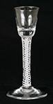 W9166 Fine Georgian Irish cordial glass with round funnel bowl with solid base decorated with basal moulded fluting, on opaque twist stem with four spiral threads over vertical gauze. Circa 1760.