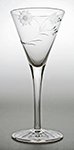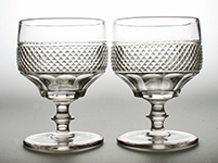 W10618 Superb pair of Art Deco port glasses with conical bowls decorated in intaglio in the 'Oleta' pattern with a band of fine horizontal mitre flutes over stylised flower buds, on tapering stems cut with hollow oval facets. Stuart & Sons, Stourbridge. Circa 1935. Height: 5⅜ inches. Price: Sold. |