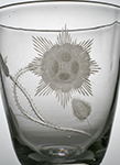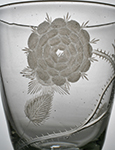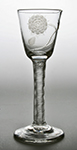 W10572 Rare Georgian Jacobite wine glass with round funnel bowl engraved with a multi-petal rose and a closed bud and a star on the reverse, on multispiral airtwist stem. Circa 1750.