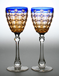 C111 Fine pair of George V double cased hock glasses with ovoid bowl cased in blue over peach over clear and cut-to-clear with five graduated rows of stars and oval lenticles, on fluted feet. Stevens & Williams, Stourbridge. Circa 1920.