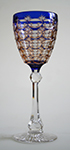 C103 Fine George V double cased hock glass with ovoid bowl cased in blue over peach over clear and cut-to-clear with five graduated rows of stars and oval lenticles, on fluted baluster stem with facet-cut shoulder knop and star-cut foot. Stevens & Williams, Stourbridge. Circa 1920.