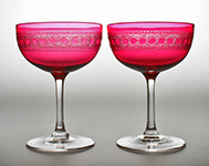 W10907 Beautiful set of Victorian champagne glasses or coupes with ruby cased bowls etched with a spotted and scrumbled band with circular lenticles, on plain stems and feet. (Two shown). Circa 1880.