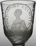 W10885 Extremely rare pair of Georgian portrait glasses of operatic significance, the ogee bowls engraved with a with a circular cartouche flanked by floral sprays and enclosing the inscription 'THE CHARMING LUCRETIA' and a portrait of the legendary high coloratura soprano Lucretia (Lucrezia) Aguiari*, on opaque twist stem with a 14-ply spiral band over two spiral tapes. Circa 1775.