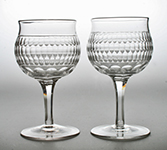 W10917 Rare pair of Victorian wine glasses with cup shaped bowls with everted rims decorated in the 'Roman'* pattern with a band of tiny tessellated oval lenticles over a basal row of circular lenticles, on fluted stems. James Powell & Sons, Whitefriars, London. Circa 1900. Height: 4¾ inches. Price: £95.00. *The pattern was based on the decoration of a Roman bowl excavated at Leuna, Saxony and now in the British Museum. |